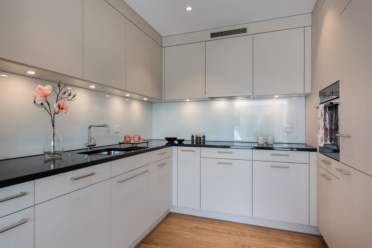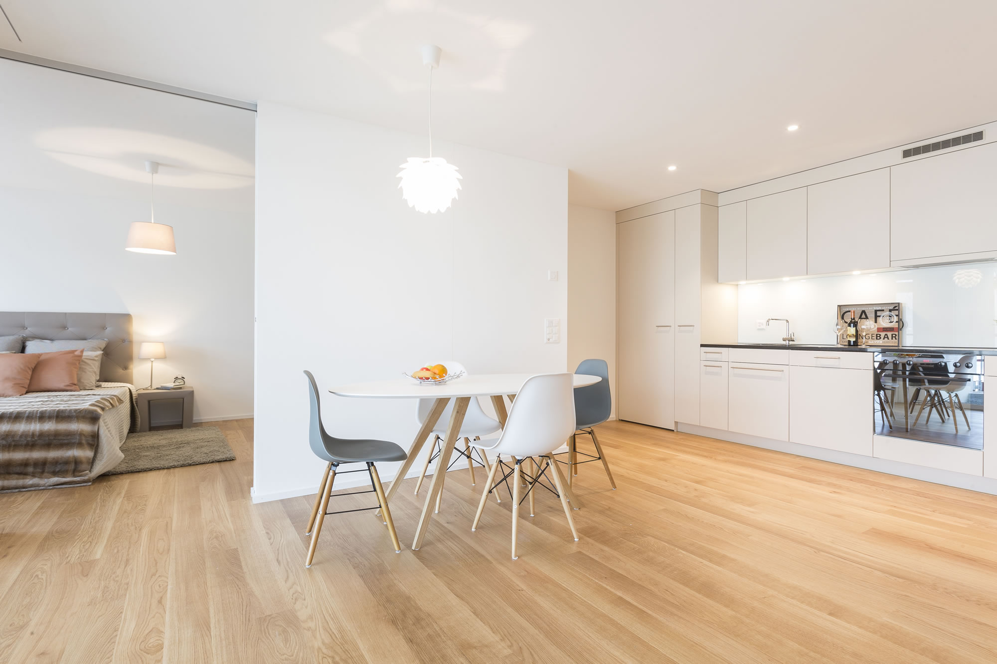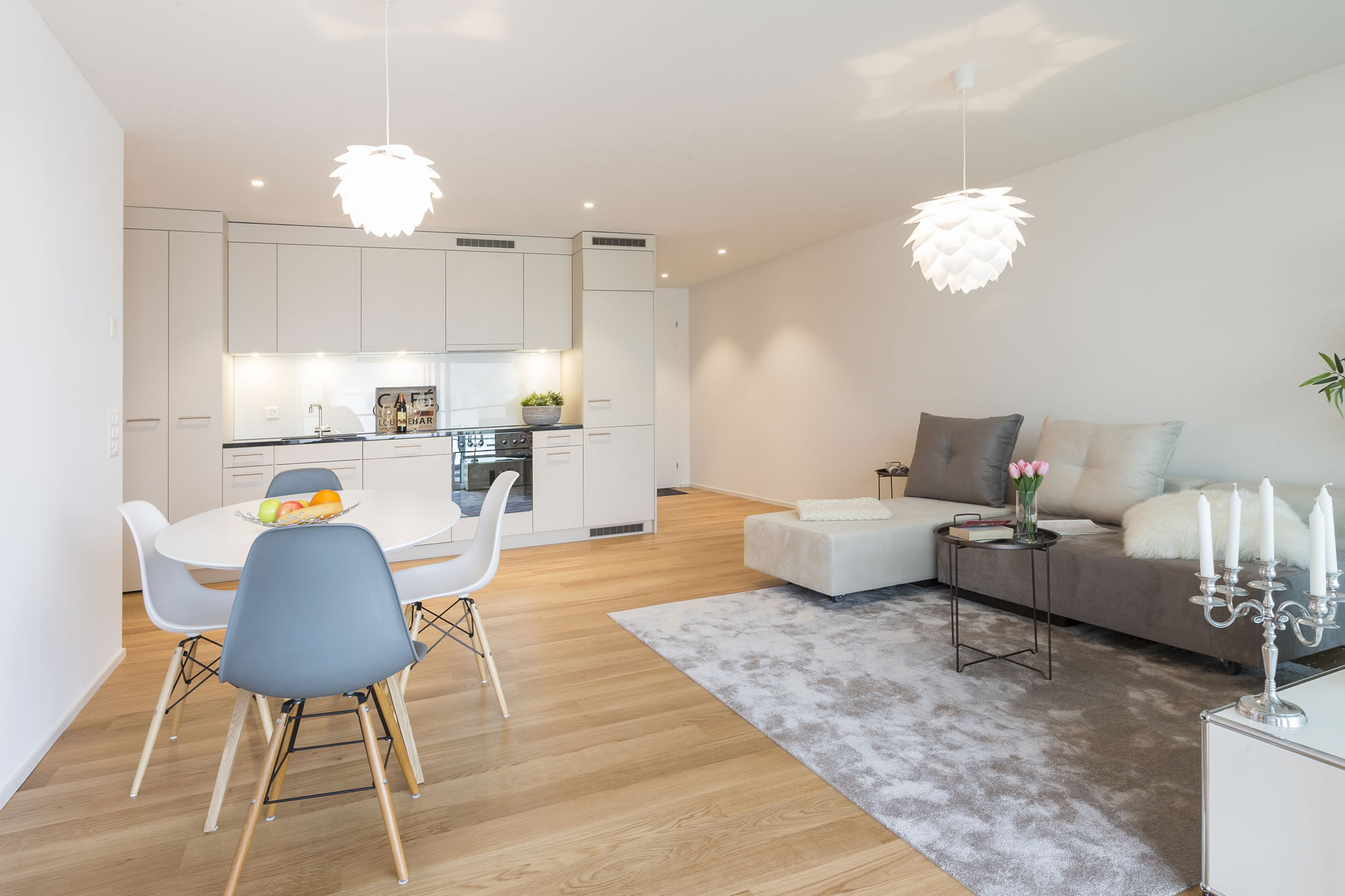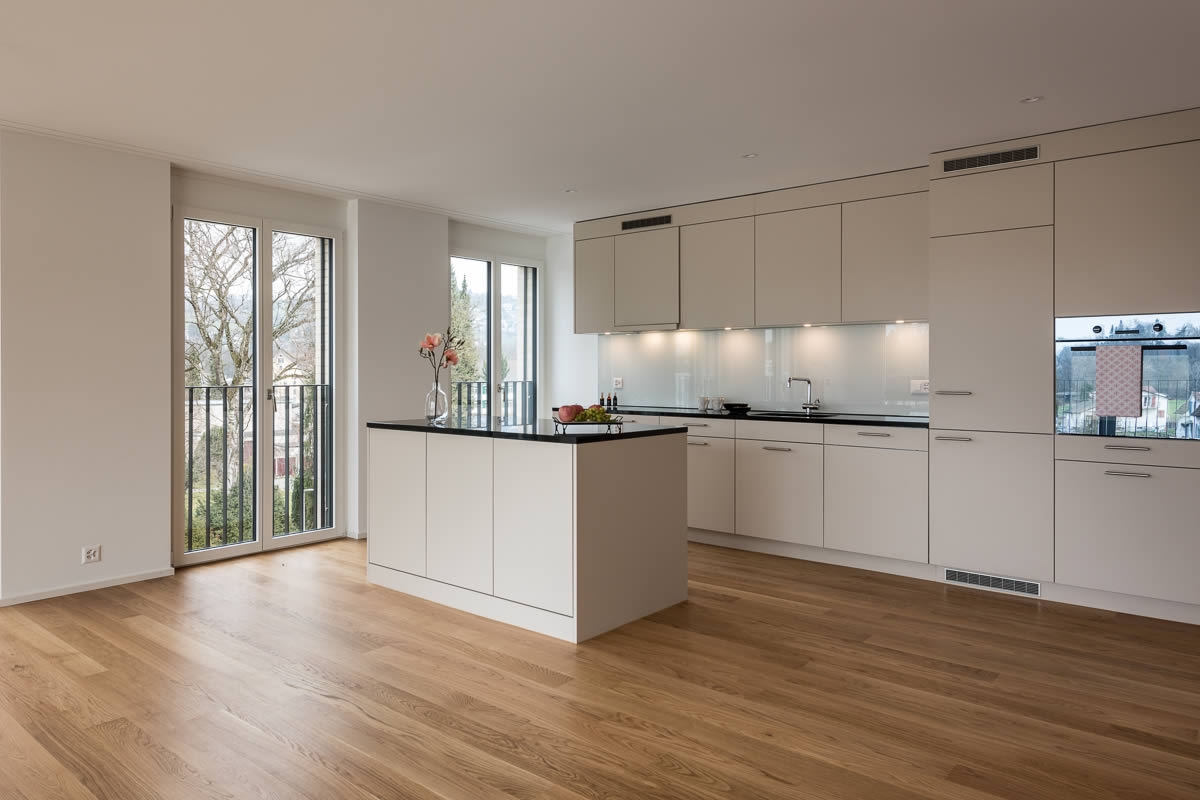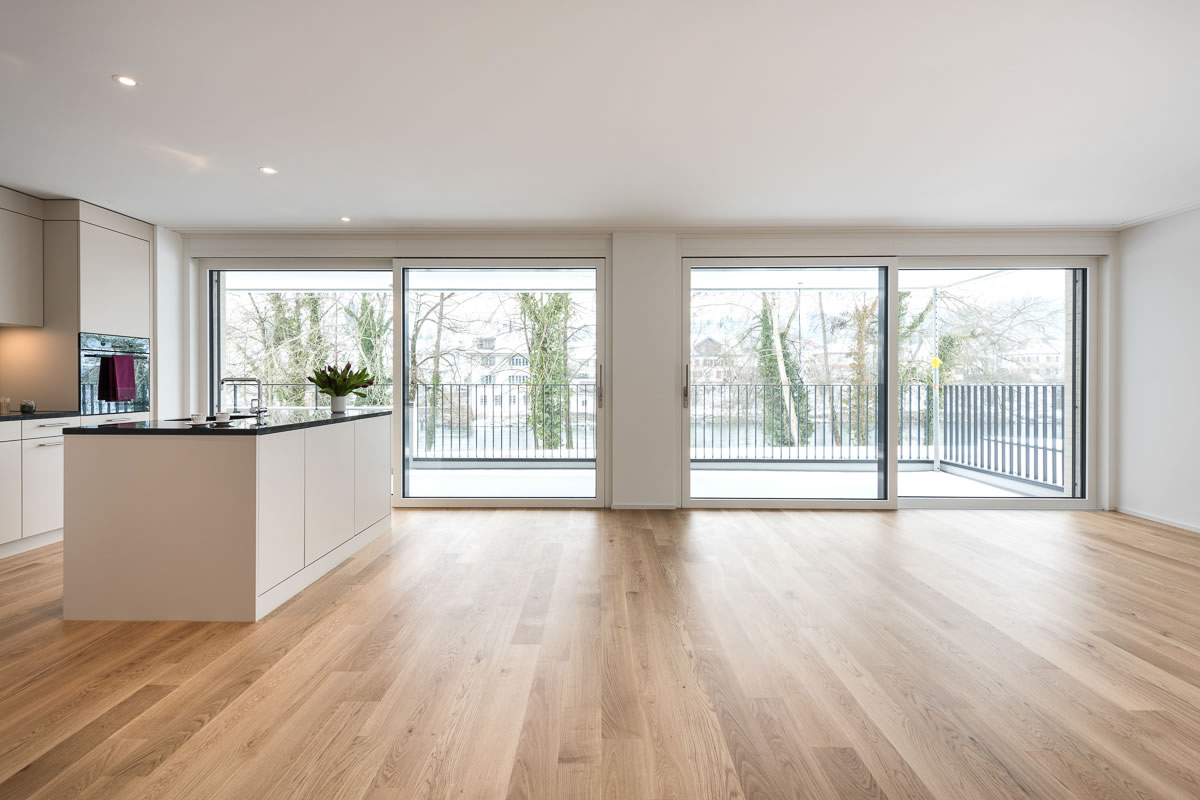 Beim Innenausbau wurde nicht nur auf hohe Qualität geachtet, sondern auch auf ein möglichst zeitloses Design. Die Küchen mit ihren Rückwänden aus Glas und den Arbeitsflächen aus Granit strahlen Eleganz aus. Die Eichenparkettböden in den Wohnräumen und die grossen Feinsteinzeugplatten in den Nassräumen verleihen den Wohnungen eine ruhige und wohnliche Atmosphäre. Jede Wohnung ist mit Glasfaseranschluss und Multimediaverkabelung ausgestattet, auch ein Waschturm mit Waschmaschine und Tumbler darf selbstverständlich nicht fehlen. Die Fenster verfügen über elektrische Lamellenstoren und die Terrassen und Balkone über elektrisch betriebene Markisen mit Wind- und Regenwächter. Nicht zuletzt profitieren Sie am Ufer von einer umweltfreundlichen und energieeffizienten Beheizung dank dem Fernwärmeanschluss an das Netz der AEW Energie AG Bremgarten.