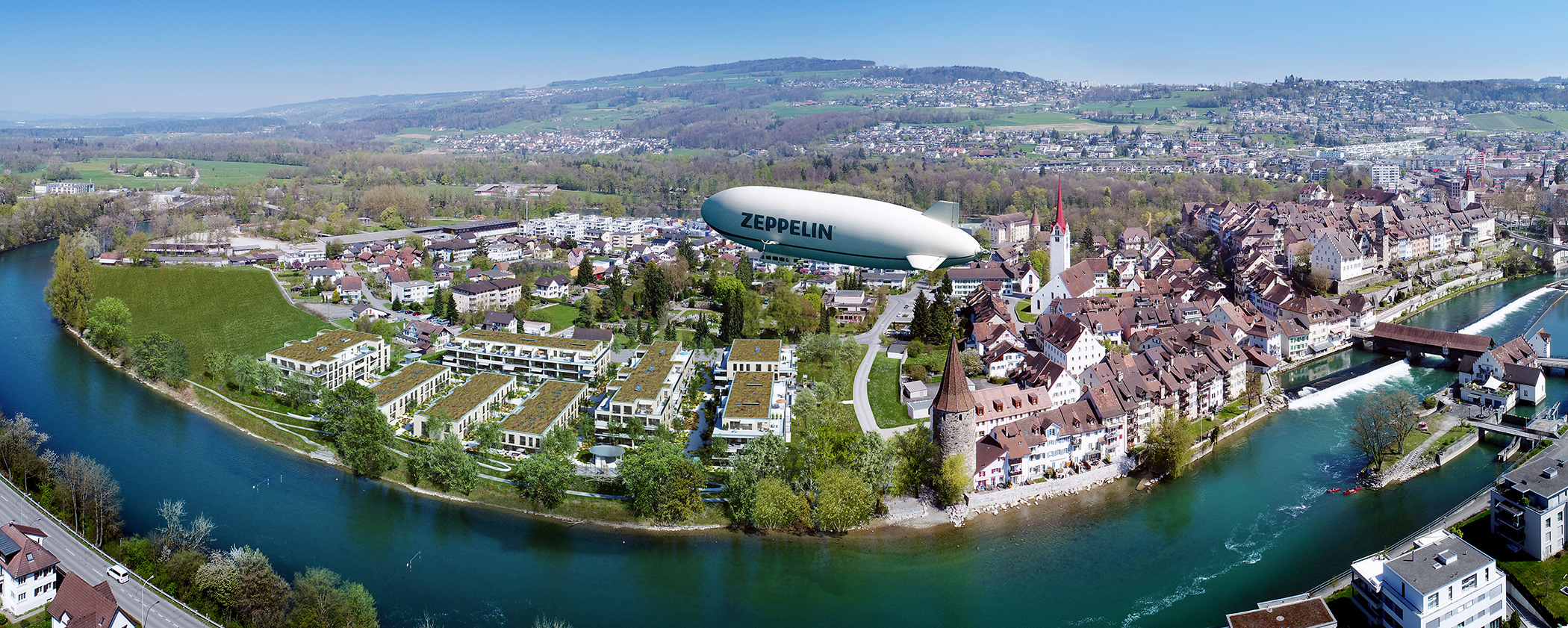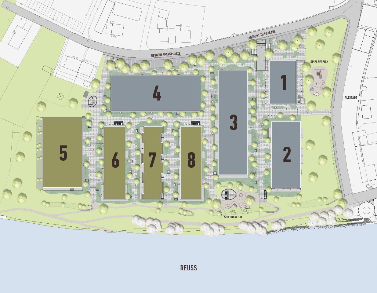 Die Umgebungsgestaltung des verkehrsfreien Wohngebiets erstreckt sich bis ans Reussufer. Die Siedlung ist durch den Privatverkehr gut erschlossen und verfügt über eine grosszügige Einstellhalle für die gesamte Überbauung.