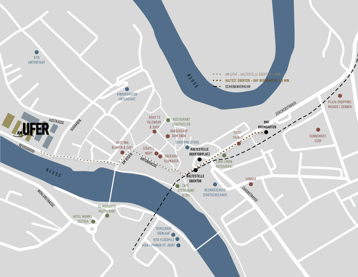 Die von einer eleganten Reuss-Schlaufe umschlossene Halbinsel Au ist ein Wohnort, wie es ihn nur selten gibt: Am natürlichen Flussufer verbinden sich Ferienstimmung am Wasser mit idyllischem Altstadtleben. Die Wohnungen und Häuser befinden sich unmittelbar vor der alten Stadtgrenze der Unterstadt, in Nachbarschaft «Hexenturm». Zum einen wohnen Sie hier direkt am Ausgangspunkt einzigartiger Schlauchboot- und Kanu-Touren oder wunderschöner Flusswanderungen. Zum andern lädt die malerische Bremgarter Altstadt mit ihren vielen kleinen Geschäften, charmanten Cafés und Restaurants zum Flanieren, Geniessen und Verweilen ein.